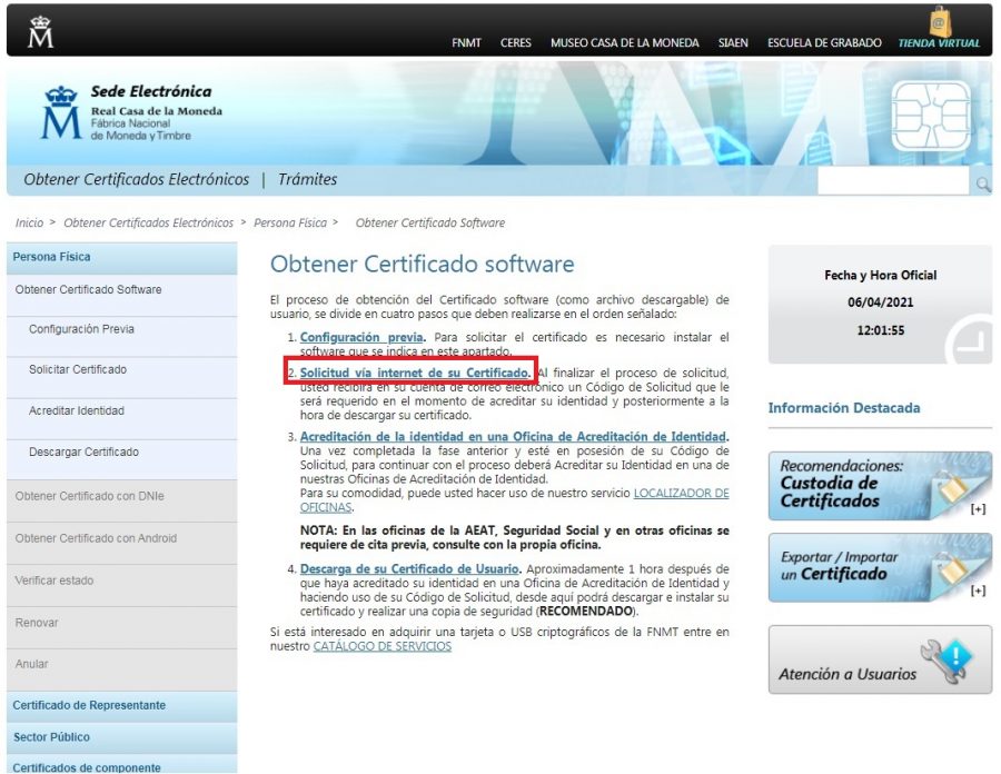 2. Seguidamente pulse en el enlace “Solicitud vía internet de su Certificado” y siga los pasos indicados.